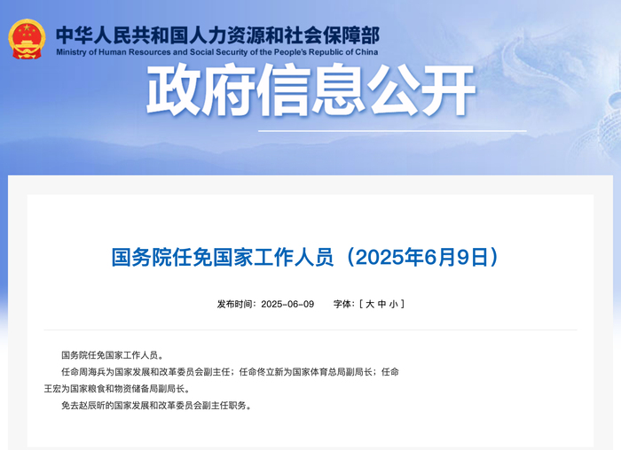 我们据人社部网站6月9日消息,国务院任免国家工作人员。
